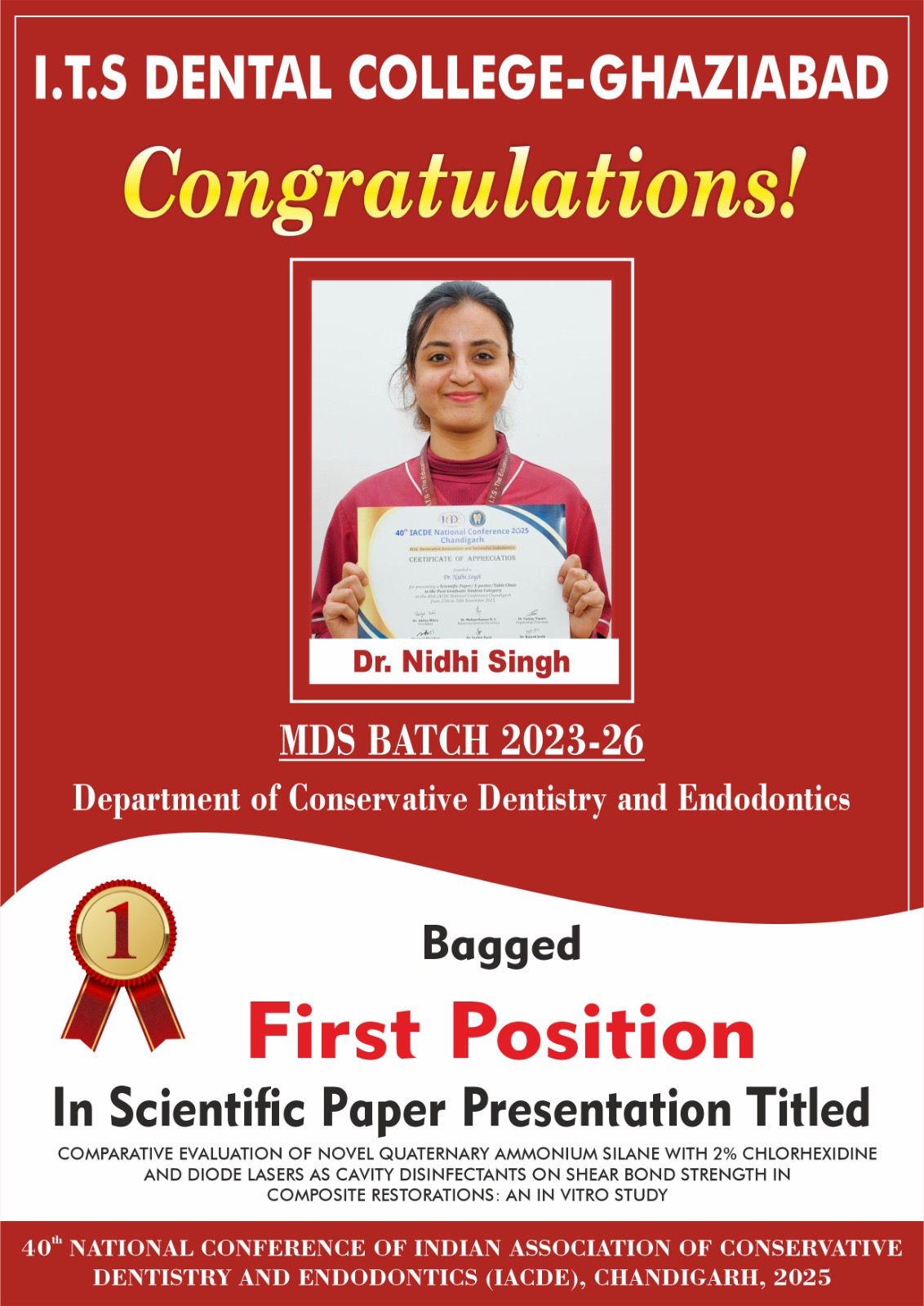 It gives us immense pleasure to share that Dr Nidhi Singh Third year PG student MDS 2023_26 from Department of Conservative Dentistry and Endodontics ITS Dental College Ghaziabad brought laurels to the college by winning First Prize in Scientific Paper Presentation at 40th IACDE National Conference 2025 held at Chandigarh from 27th to 30th November 2025